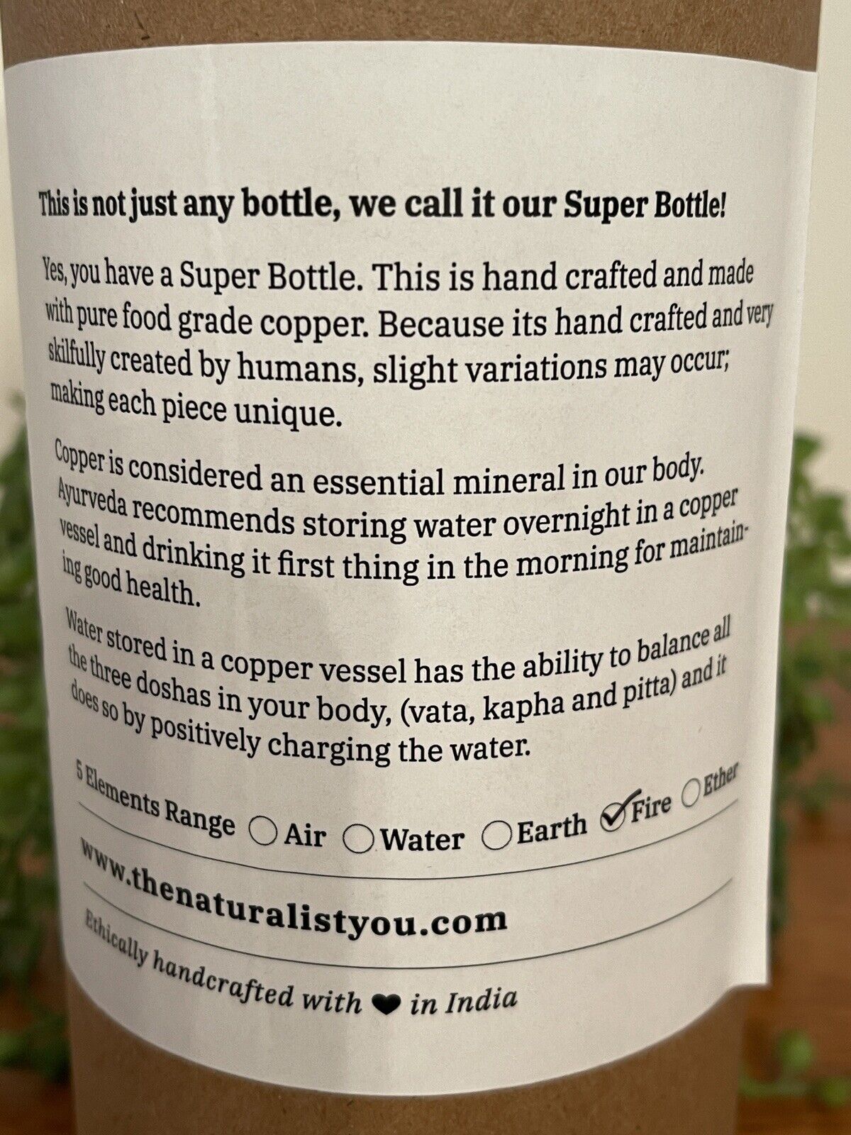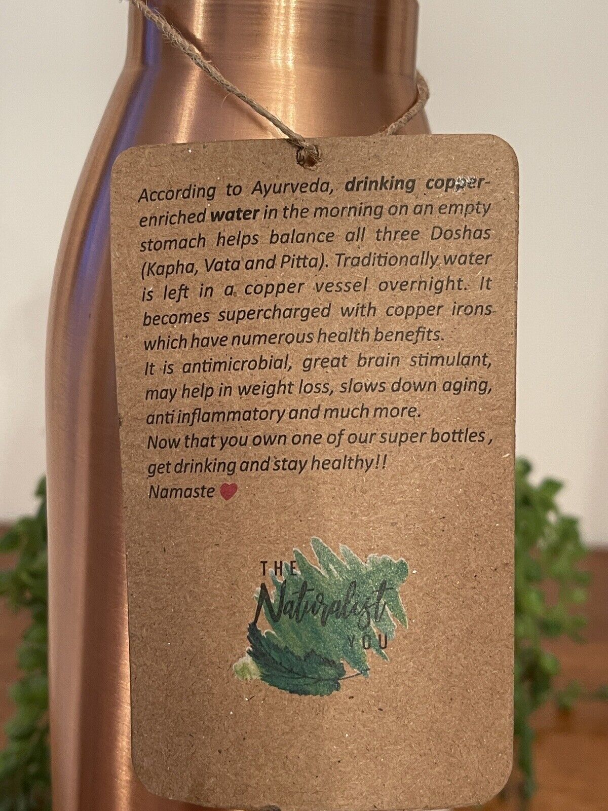 THE PERFECT WAY TO CHILL WATER Copper Bottles helps water stay cooler for longer. THIS BOTTLE IS HEAT SENSITIVE; LET HOT DRINKS SUCH AS HOT WATER, TEA THAN BOTTLE WILL BE HOT. AYURVEDA BENEFITS ESSENTIAL Allows drinking water to rest in the glass over night for health benefits. Copper melts away the excess fat. Copper water helps in maintaining digestive health, reduces fat and alleviates excess obesit.