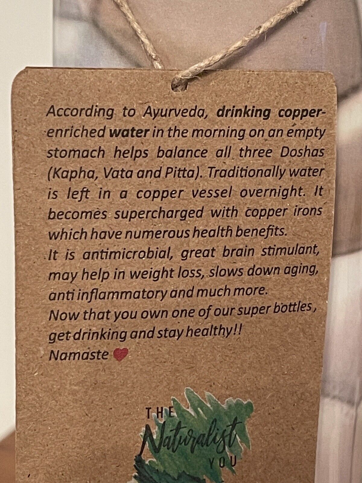 THE PERFECT WAY TO CHILL WATER Copper Bottles helps water stay cooler for longer. THIS BOTTLE IS HEAT SENSITIVE; LET HOT DRINKS SUCH AS HOT WATER, TEA THAN BOTTLE WILL BE HOT. AYURVEDA BENEFITS ESSENTIAL Allows drinking water to rest in the glass over night for health benefits. Copper melts away the excess fat. Copper water helps in maintaining digestive health, reduces fat and alleviates excess obesit.